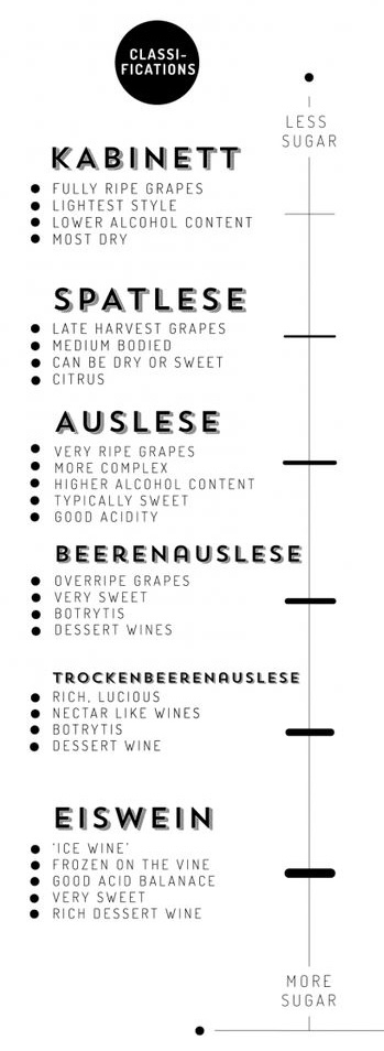 Here are all 6 Riesling classifications, organized by sweetness. Kabinett is driest, with Trockenbeerenauslese and Eiswein the sweetest.